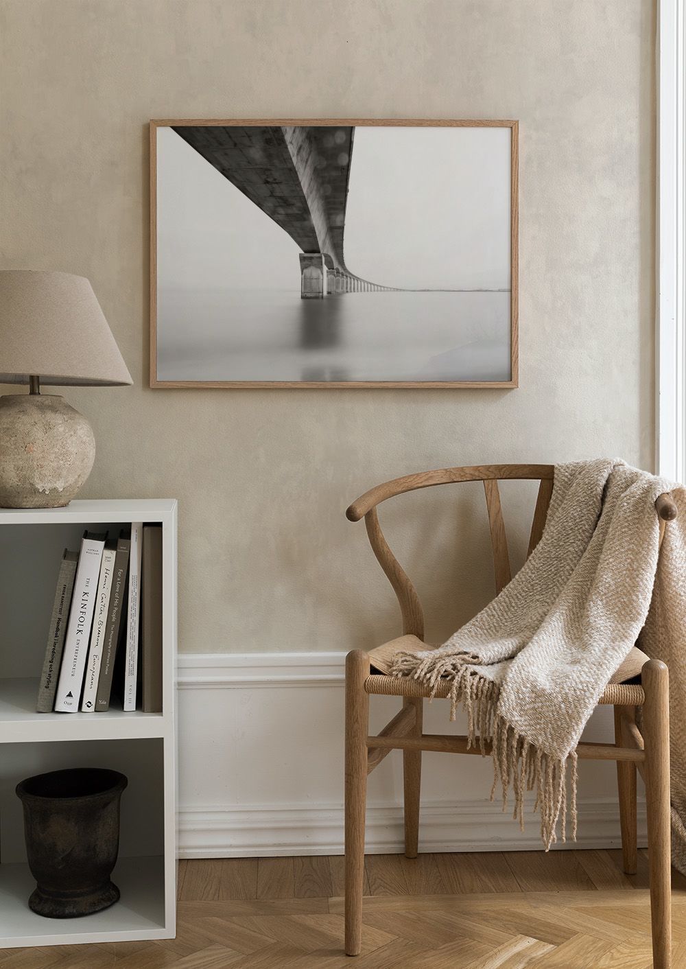 Ein Poster einer langen, geschwungenen Brücke über ruhigem Wasser. Das Schwarz-Weiß-Foto zeigt dicke Pfeiler und ein Betonmuster, perfekt für moderne Räume.