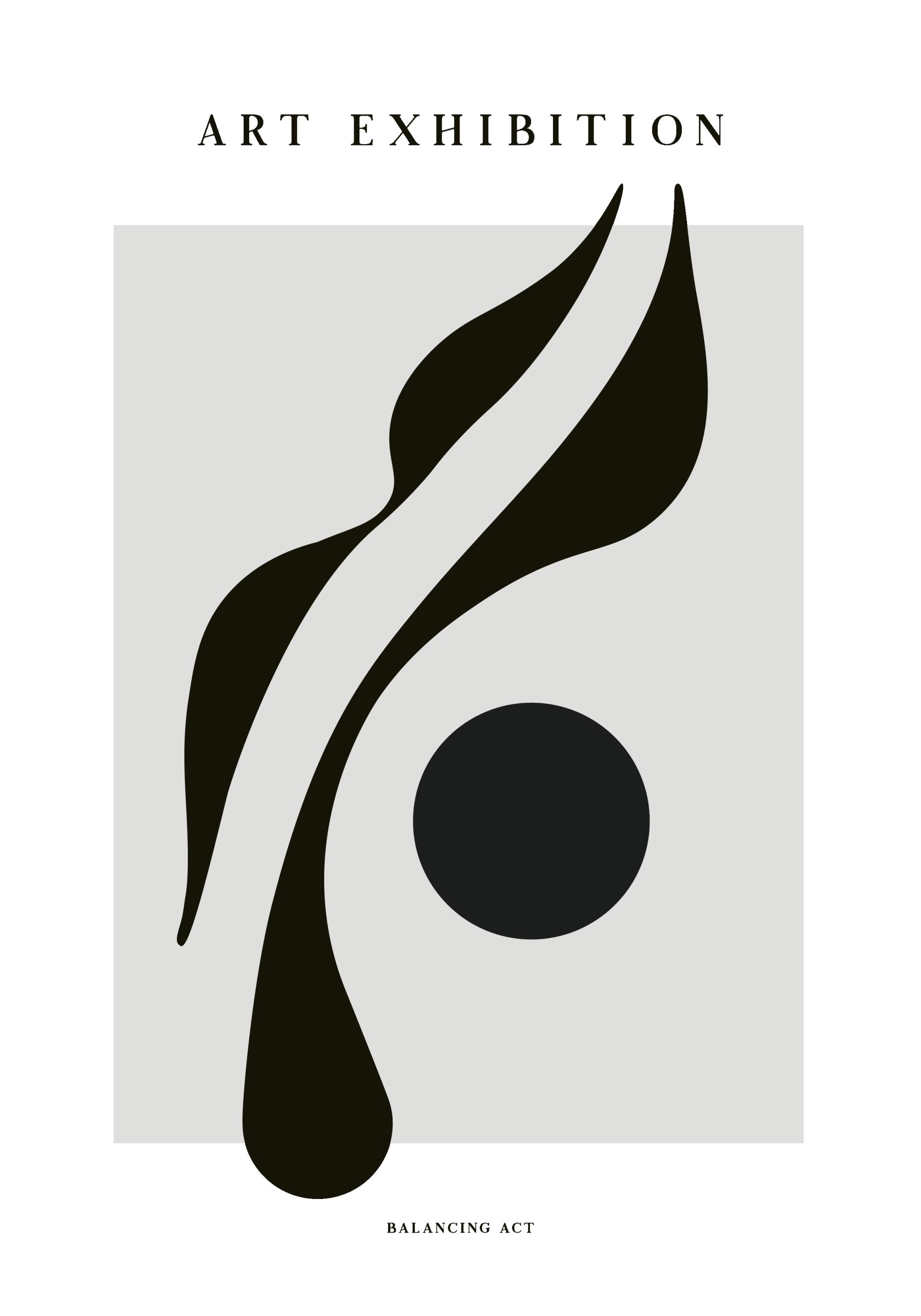 Ein Poster mit schwarzen Formen auf weißem Hintergrund. Es zeigt geschwungene Linien und einen Kreis, dazu die Texte "ART EXHIBITION" und "BALANCING ACT".