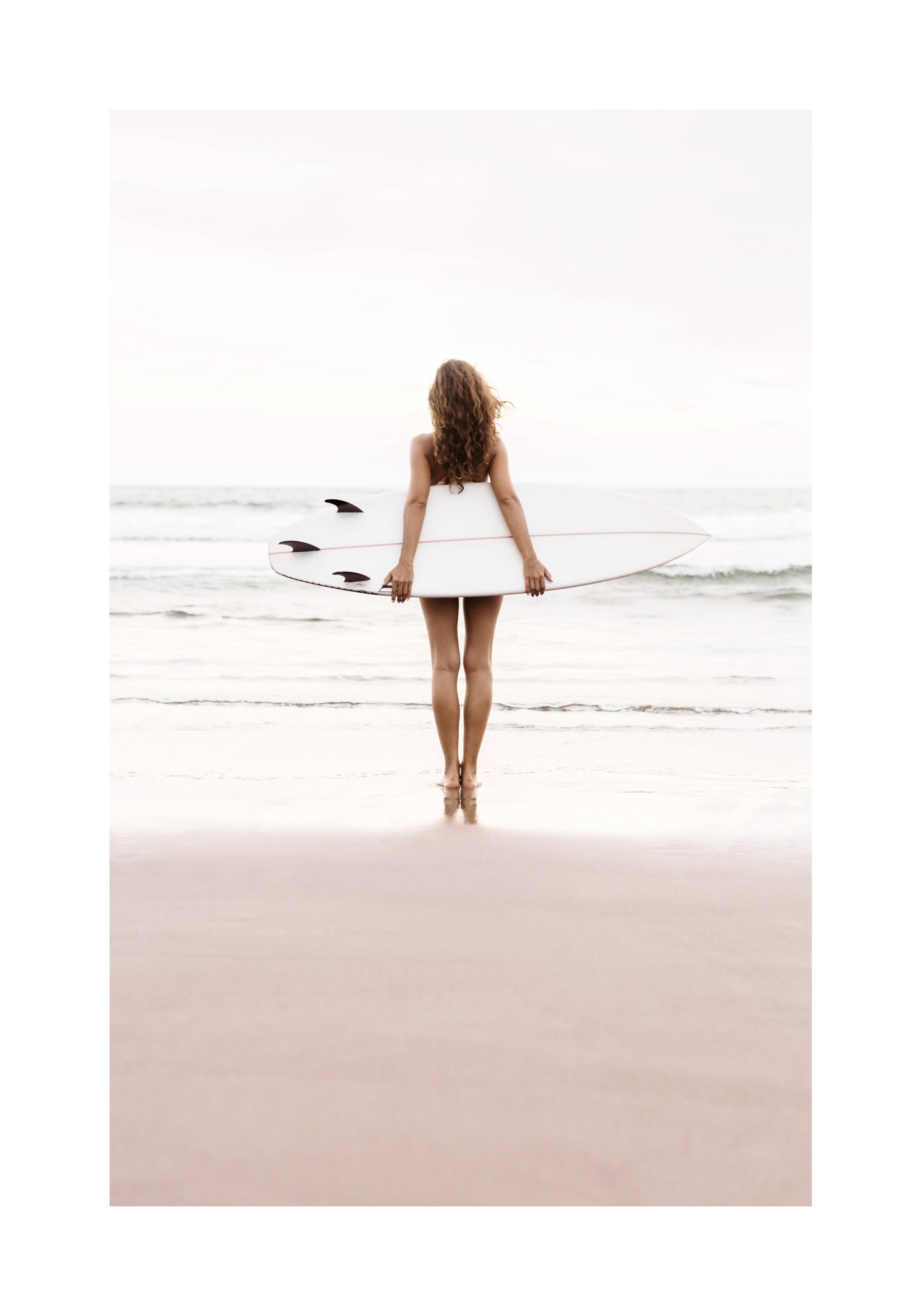 Ab 7,77 €Schönes Fotoposter von einer jungen Frau, die mit ihrem Surfbrett am Strand steht und auf das Meer blickt. Das Fotokunstposter ist ideal für alle Surfliebhaber oder welche, die es noch werden wollen.