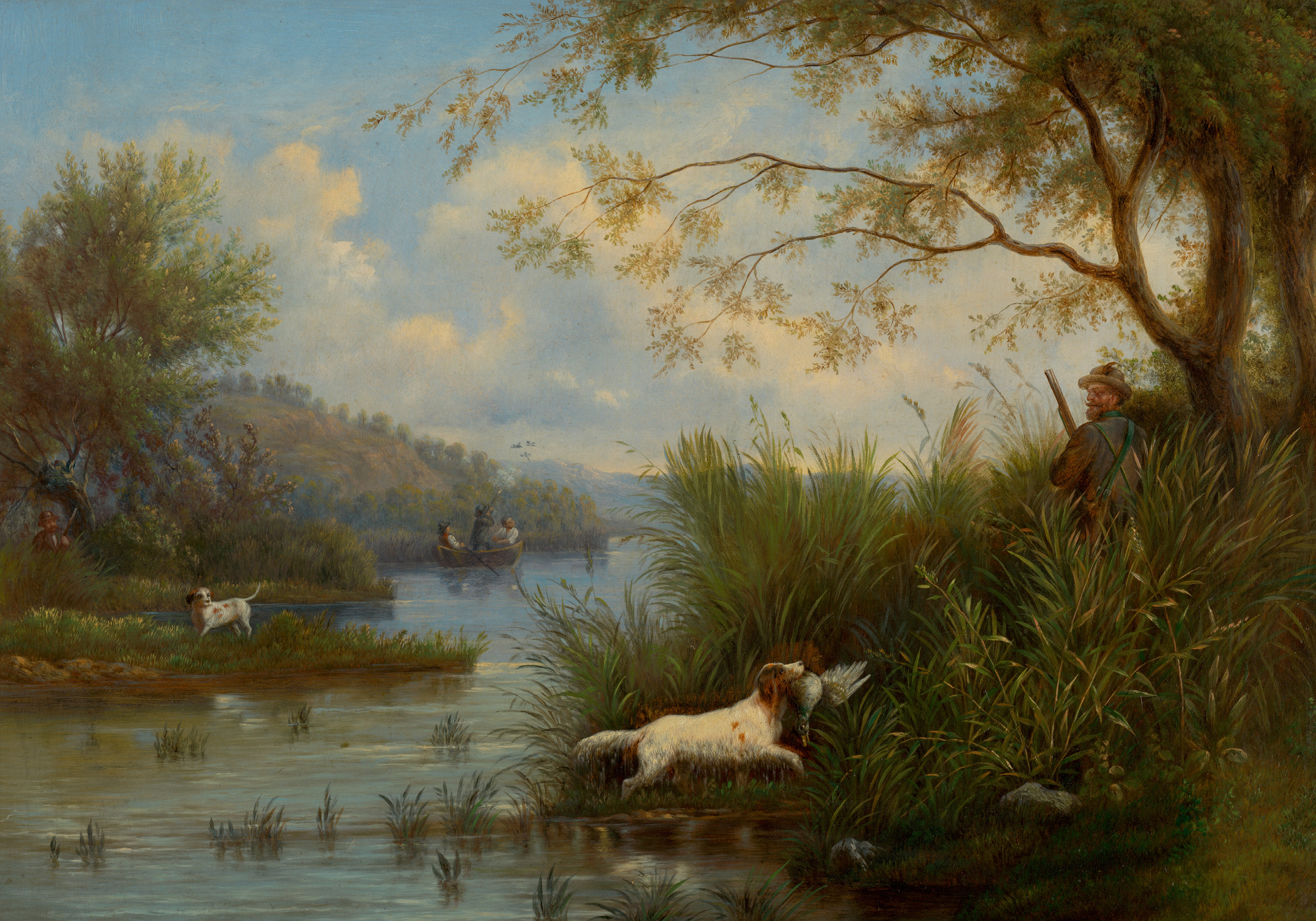 Ein Poster einer friedlichen Flusslandschaft mit Personen in einem Boot und einem Mann unter einem Baum. Blauer Himmel mit Wolken und grüne Hügel.