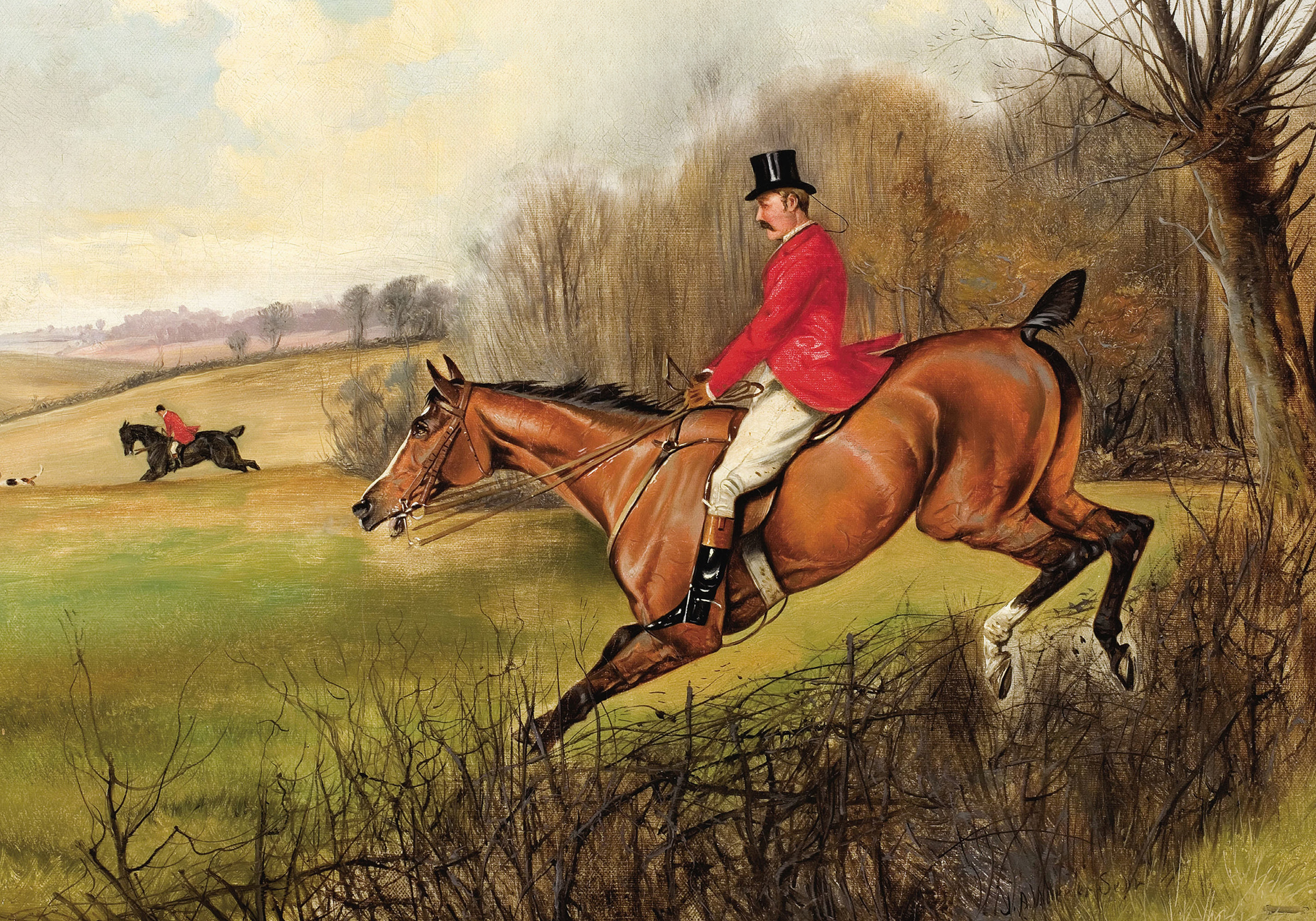 Ab 3,87 €Ein Poster, das einen Reiter in einem roten Mantel und schwarzen Zylinder auf einem braunen Pferd zeigt, der über einen Busch springt. Der Hintergrund zeigt eine Wiese mit Bäumen, einem weiteren Reiter und einem Hund.