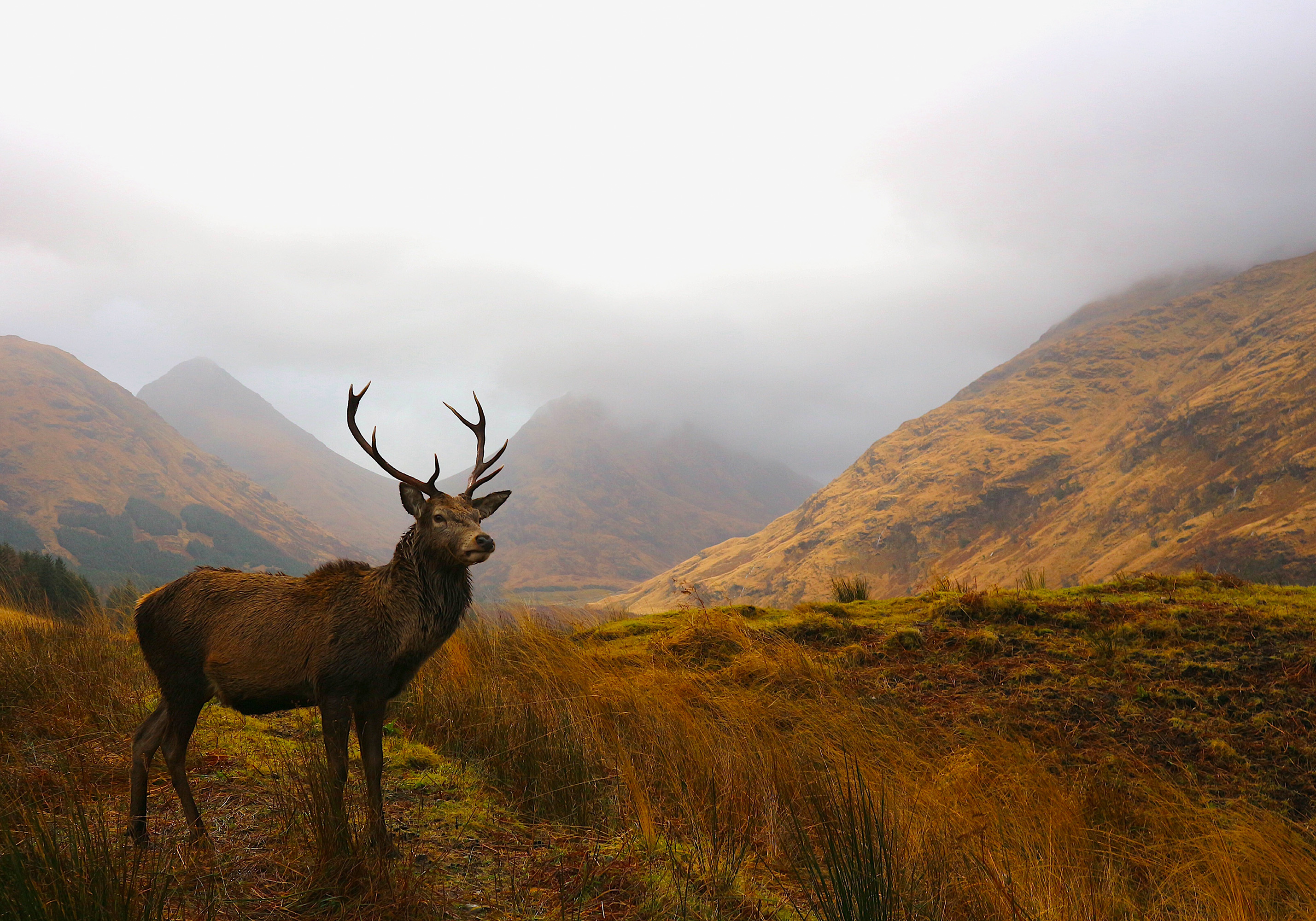 Ab 3,87 €Ein Poster mit einem Hirsch mit einem großen Geweih, der auf einer Wiese in den schottischen Highlands steht. Das Gras ist gelb und braun, unter bewölktem, grauem Himmel und nebligen Bergen im Hintergrund.