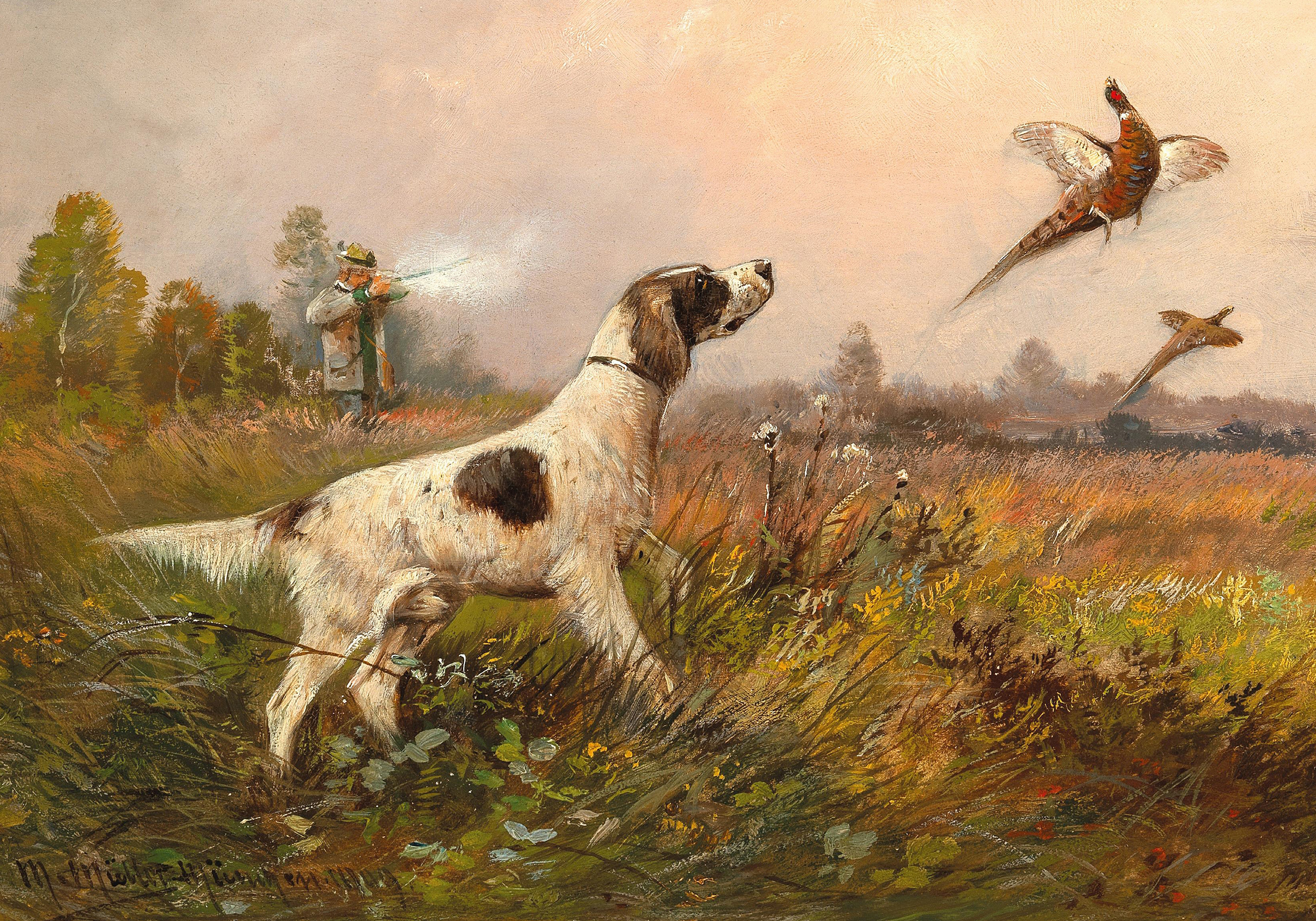 Ab 3,87 €Ein Poster, das eine Jagdszene mit einem Hund, Vögeln und einem Mann mit Gewehr auf einer grasbewachsenen Wiese zeigt. Bäume in herbstlichen Farben im Hintergrund verleihen dieser klassischen Outdoor-Szene Wärme.