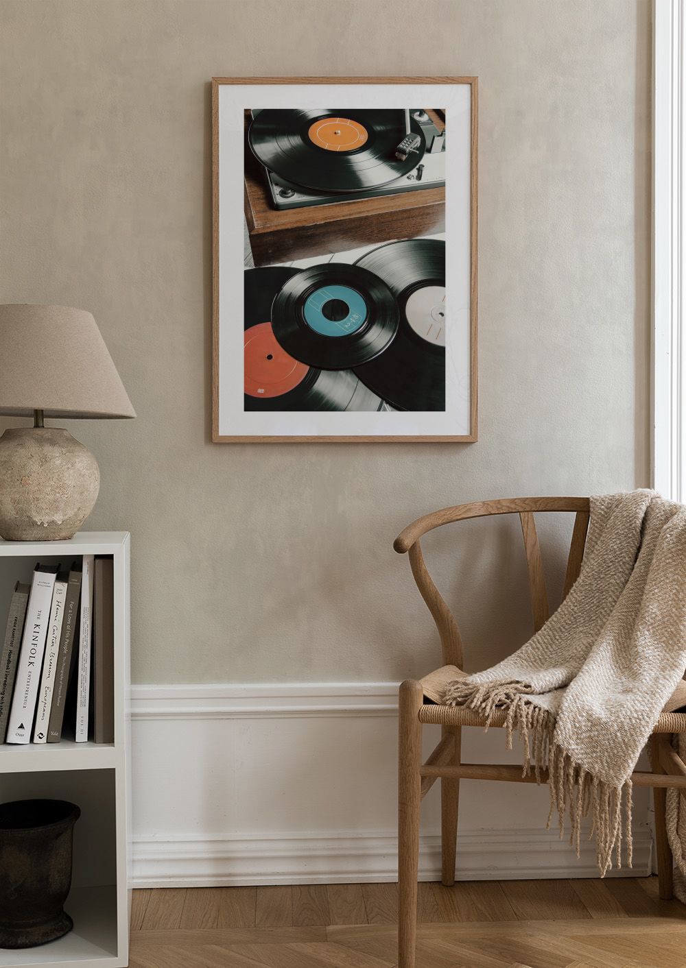 Ein Poster eines Plattenspielers aus Holz mit schwarzen Schallplatten in Orange, Rot und Blau. Perfekt für Musikliebhaber und Vintage-Fans.