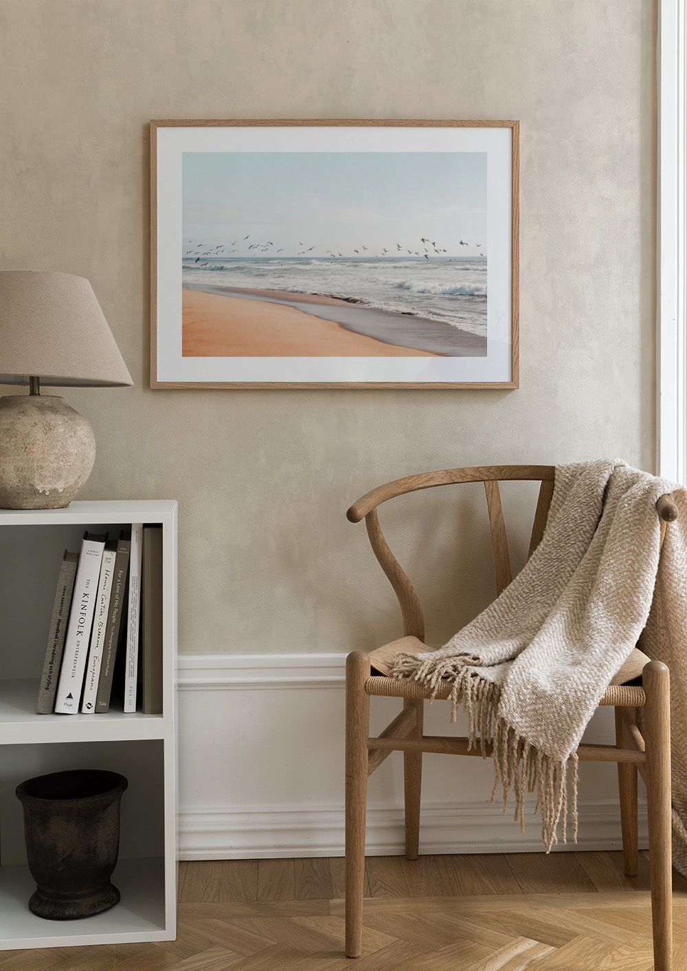 Ein Fotoposter eines sandigen Strandes mit sanften Wellen und vielen Vögeln am Himmel. Die hellen Blau- und Brauntöne schaffen eine ruhige Stimmung in deinem Zuhause.
