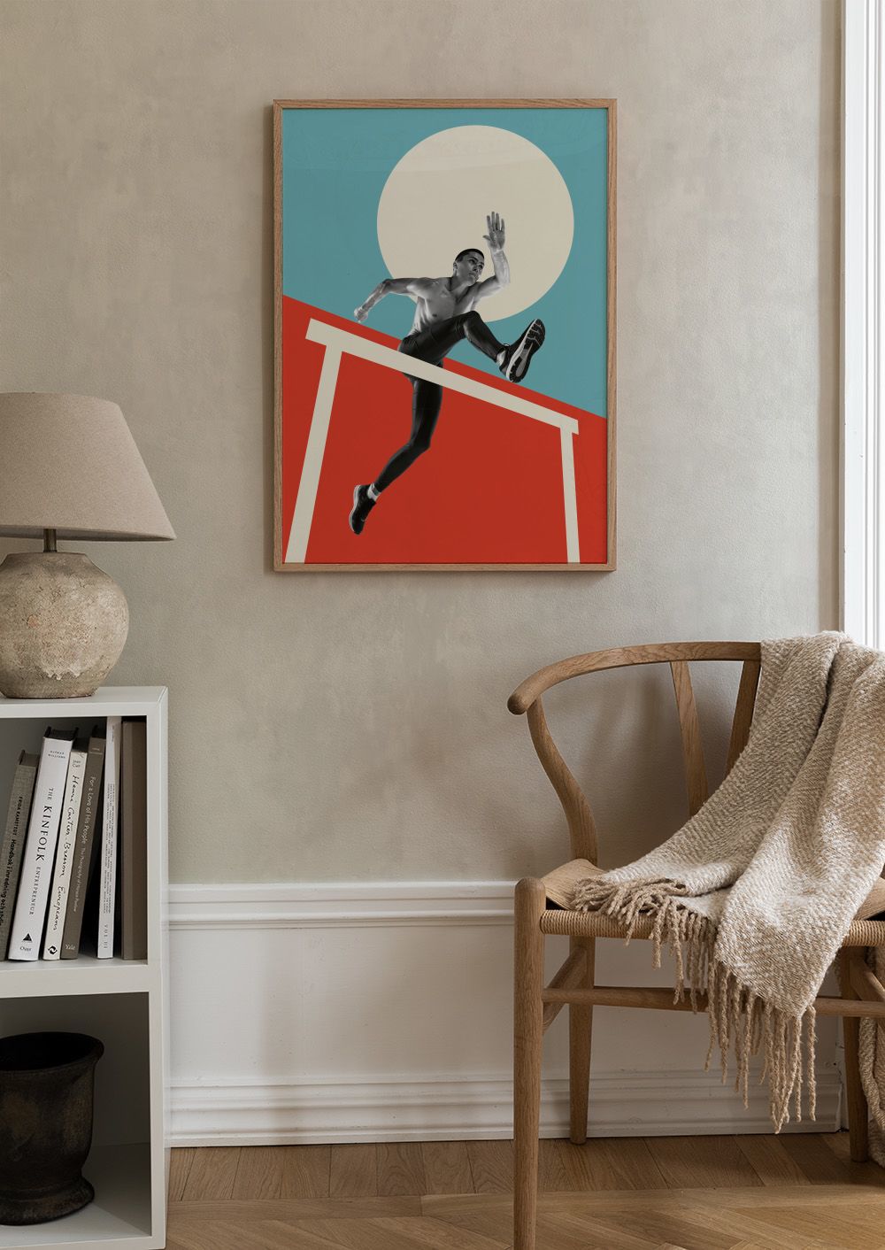 Ein Poster eines Athleten, der über eine Hürde springt. Der schwarz-weiße Körper hebt sich von dem bunten Hintergrund mit blauem Himmel und roter Laufbahn ab.