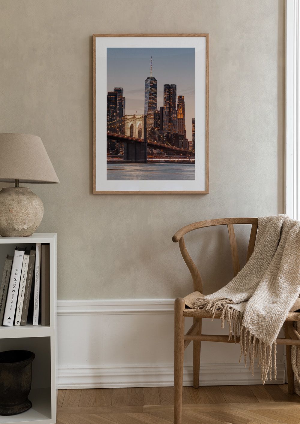 Ein schönes Poster der Brooklyn Bridge mit hohen Gebäuden im Hintergrund. Der Himmel zeigt sanfte Orange- und Blautöne, die sich im Wasser spiegeln.