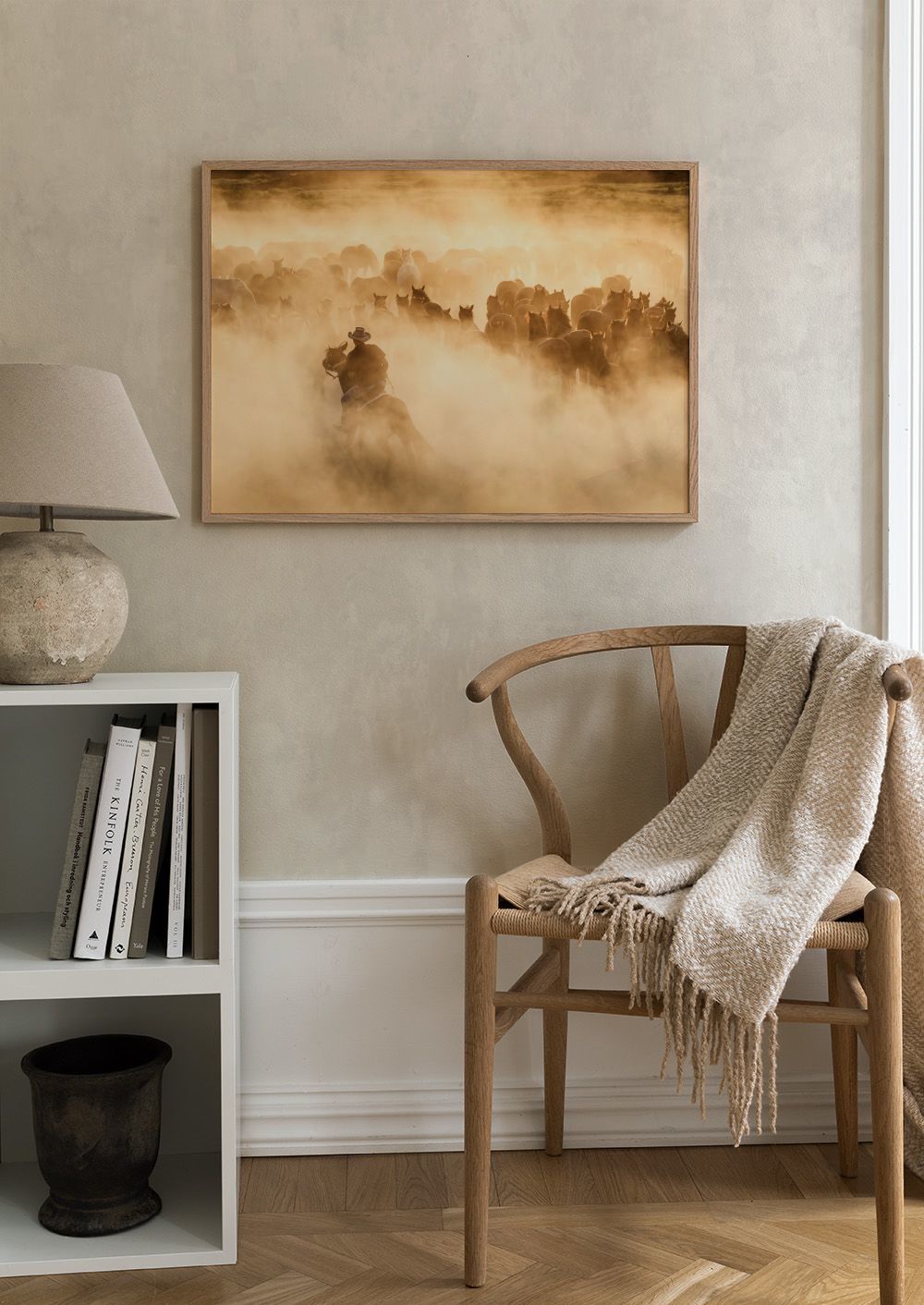 Ein Cowboy auf seinem Pferd inmitten einer großen Pferdeherde. Die Szene erstrahlt in warmem, goldenem Licht mit Staub in der Luft. Perfekt für alle, die den Wilden Westen lieben.