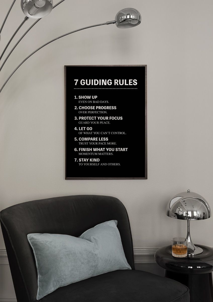 Ein motivierendes Poster mit 7 Leitregeln auf schwarzem Hintergrund mit weißem Text. Perfekte Wandkunst, um dich jeden Tag zu inspirieren.