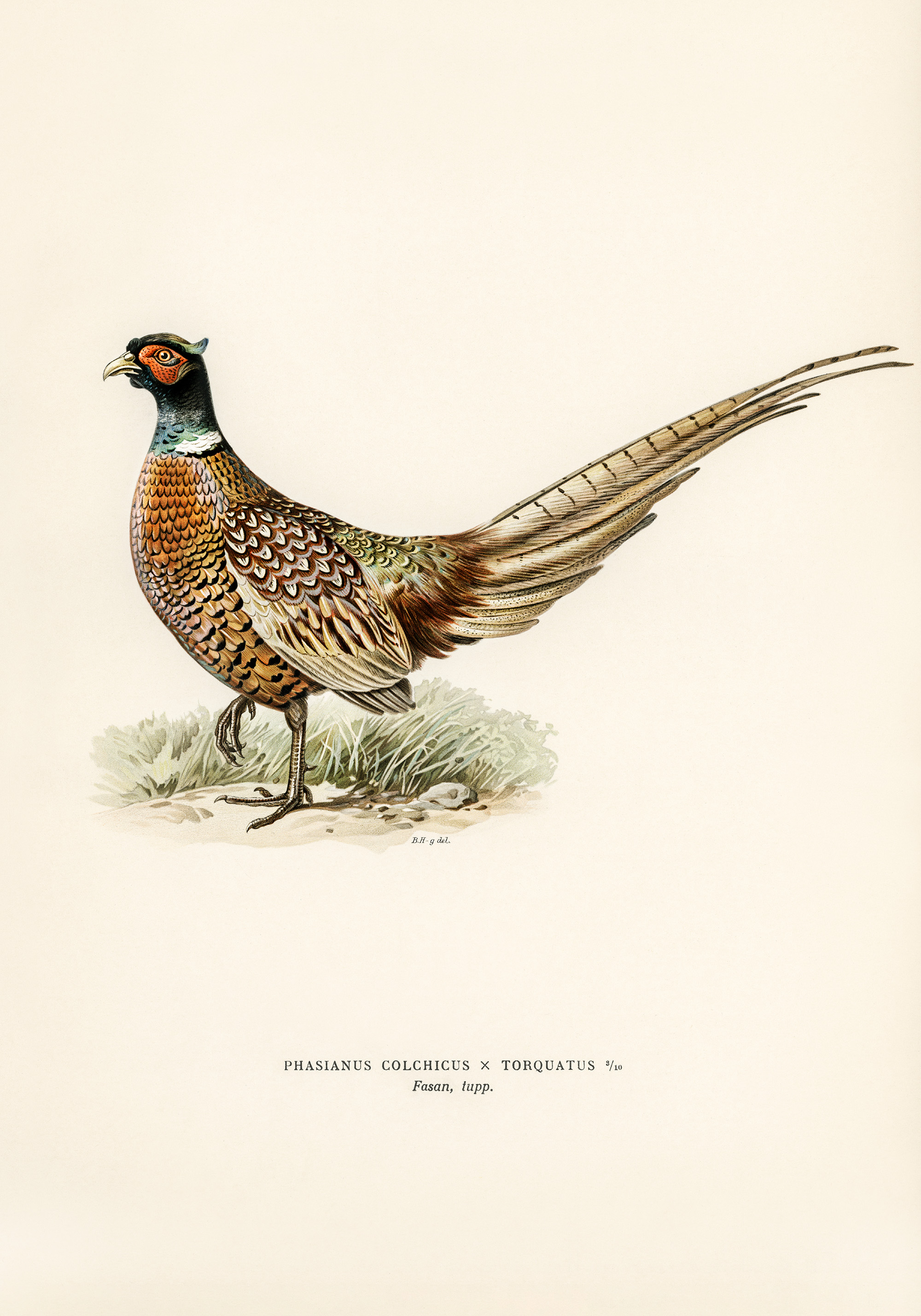 Ein Poster eines bunten Vogels mit langem Schwanz, der auf Gras steht. Der Vogel hat braune, grüne und blaue Federn mit einem roten Fleck um das Auge.